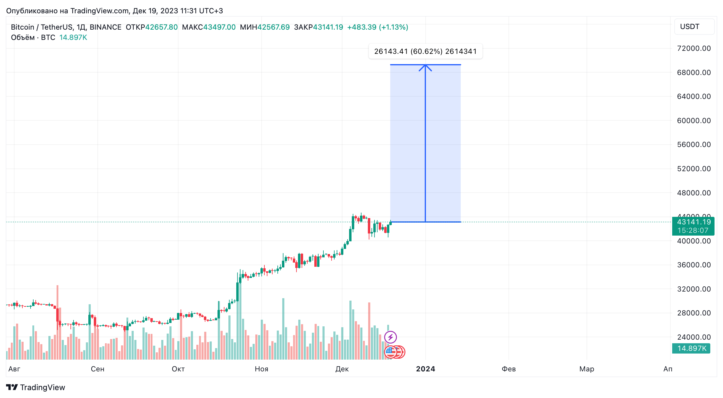 Ян ван Эк ожидает роста цены BTC до нового исторического максимума в ближайшие двенадцать месяцев. Это вполне достижимая цель даже за более короткий срок, считают эксперты. Чтобы её достичь, Биткоину нужно прыгнуть выше 69 тысяч долларов, уровень которых был зафиксирован в ноябре 2021 года.