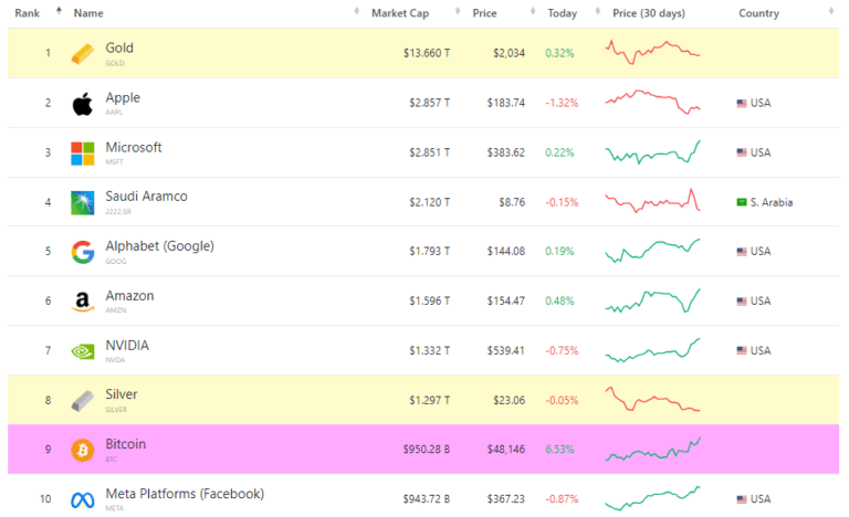 Биткоин продвинулся дальше в рейтинге топ-10 крупнейших активов/контрагентов по показателю рыночной капитализации, согласно Companies Market Cap. Он поднялся на девятую позицию, оставив позади компанию Meta (признана экстремистской организацией в РФ).