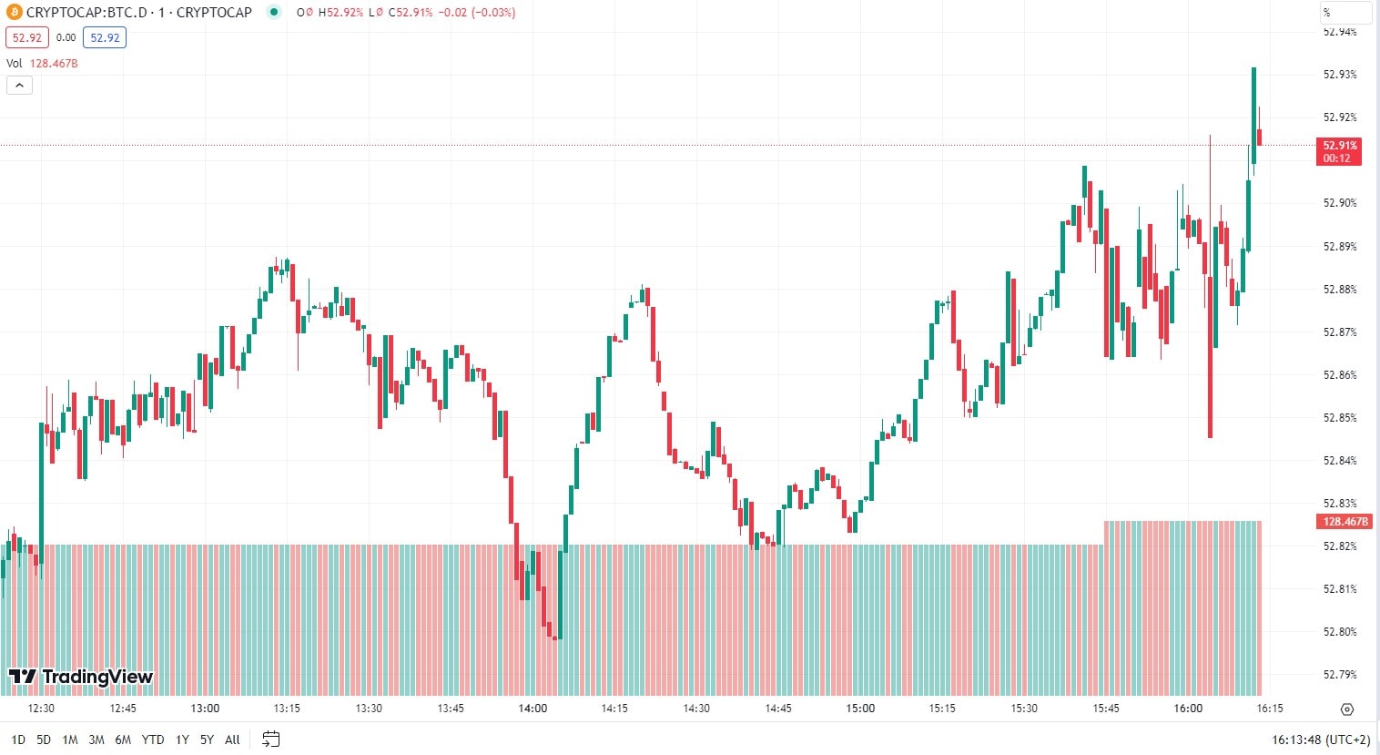 На фоне скачка курса вырос показатель доминирования актива на криптовалютном рынке. В моменте он приблизился к 53%, согласно TradingView: