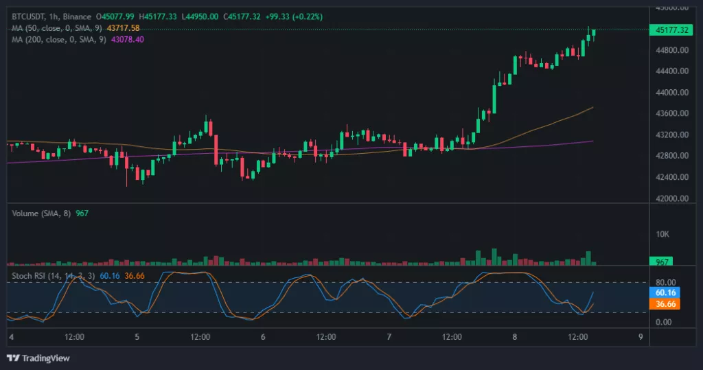 Первая криптовалюта вновь продемонстрировала уверенный рост, закрепившись над уровнем $45 000.