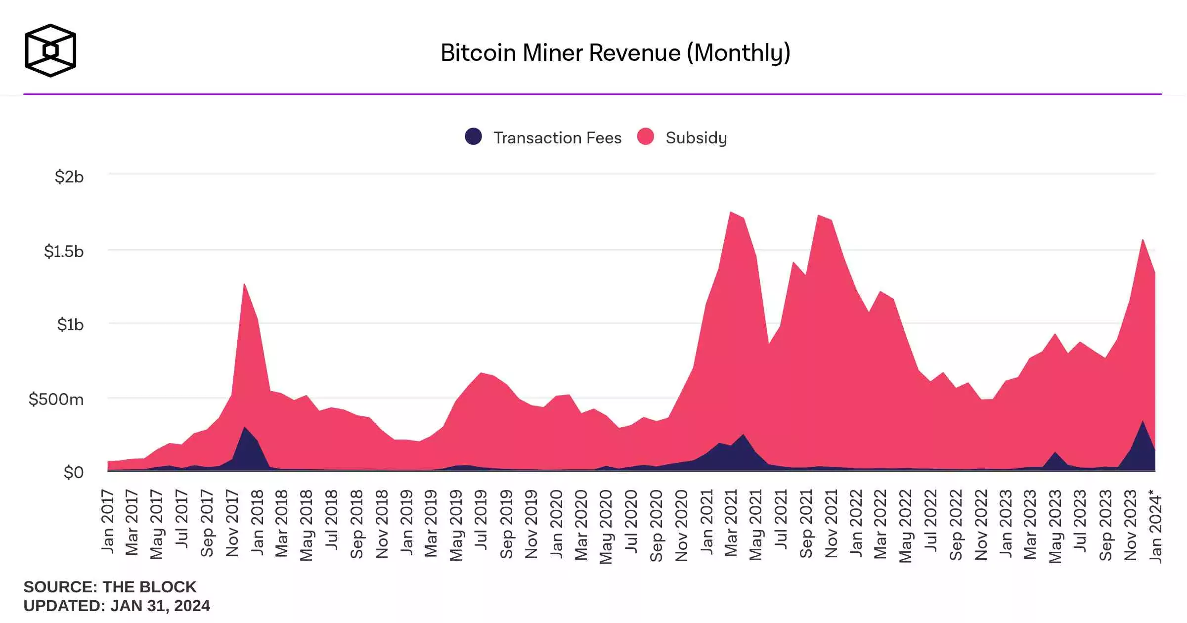 По данным The Block Data Dashboard, вознаграждения, которые майнеры получают за создание действительных блоков и обработку транзакций, снизились с многолетнего максимума в декабре.