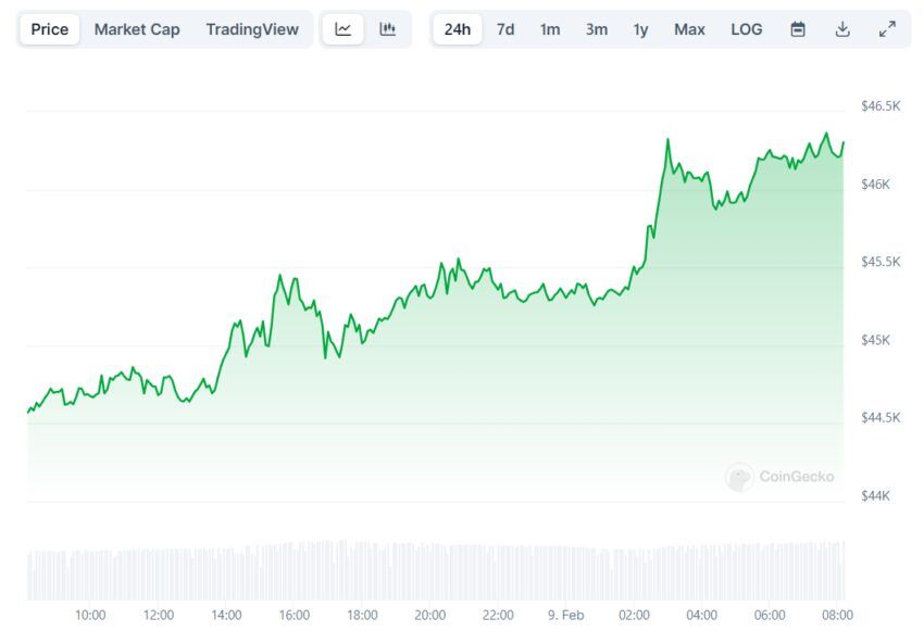 По данным CoinGecko, на момент публикации материала первая криптовалюта торгуется по $46 214. За последние сутки цена в совокупности выросла на 3,8%.