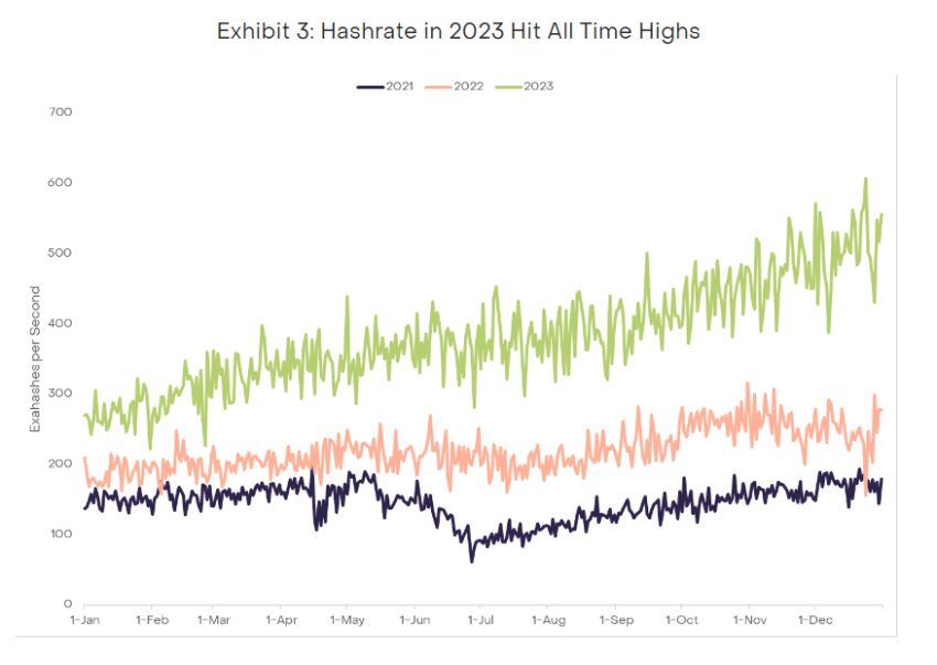 В 2023 году средний хэшрейт за семь дней вырос с 255 EH/s до 516 EH/s, то есть на 102%. Годом ранее показатель в совокупности увеличился на 41%. Во многом рост объясняется значительным увеличением стоимости биткоина.