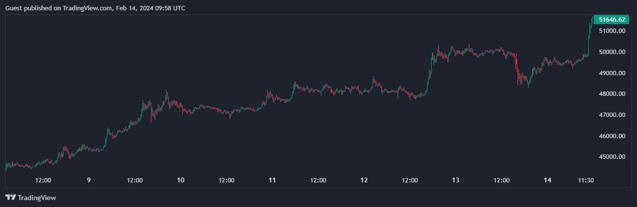 За неделю прирост по этой позиции достиг 19,81%, согласно TradingView. На момент написания актив торгуется по $51 646: