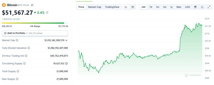 По данным CoinGecko, на момент написания материала биткоин торгуется по $51 567. За прошедшие сутки цена актива укрепилась на 3,4%.