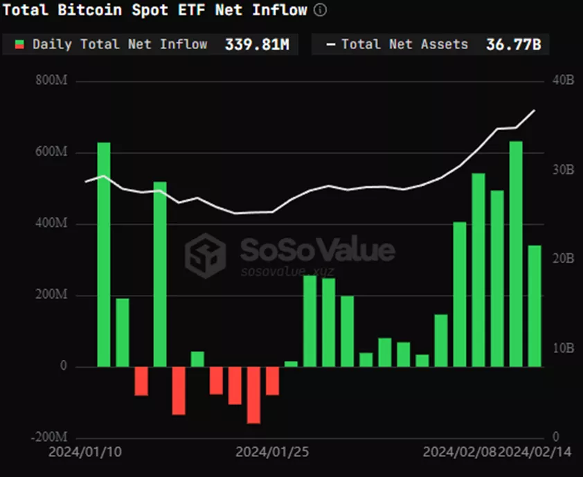 According to SoSoValue, on February 14th, the total net inflow for Bitcoin spot ETFs was $339 million, marking fourteen consecutive trading days of net inflows. Grayscale ETF GBTC experienced a net outflow of $131 million in a single day, while Invesco's Bitcoin ETF BTCO saw a… pic.twitter.com/nu7H2pPKph