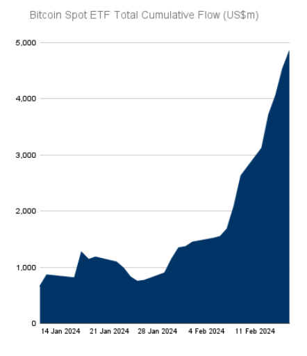 Вторым катализатором для роста, вероятно, станет продолжающийся приток средств в спотовые ETF на базе биткоина, утверждает аналитик. Более $4 млрд поступило в соответствующие продукты за месяц их существования.