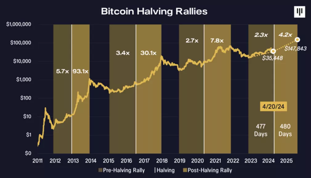 Основываясь на предыдущих циклах халвинга, можно ожидать снижения цены биткоина к $35 448 в апреле 2024 года с последующим ростом к $147 000 в 2025 году. Такие прогнозы представили в Pantera Capital.