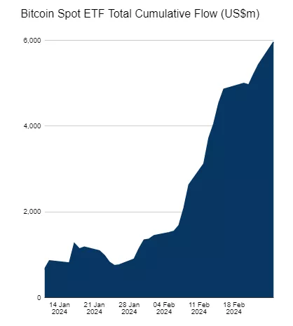 По данным SoSoValue, 26 февраля совокупный чистый приток в биржевые фонды на базе первой криптовалюты превысил $6 млрд. С 26 января по 20 февраля наблюдался чистый приток в течение 17 дней подряд.