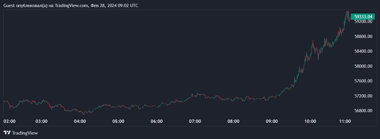28 февраля 2024 года курс биткоина преодолел отметку сначала в $58 000, а затем и в $59 000. Актив пытается закрепиться выше этого уровня.