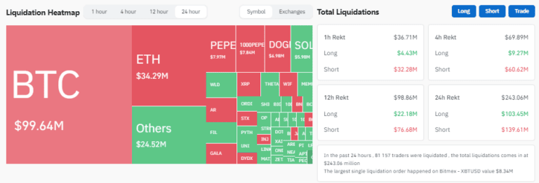 Объем ликвидаций по фьючерсным контрактам на рынке криптоактивов вырос до $243 млн. При этом короткие позиции превалируют: