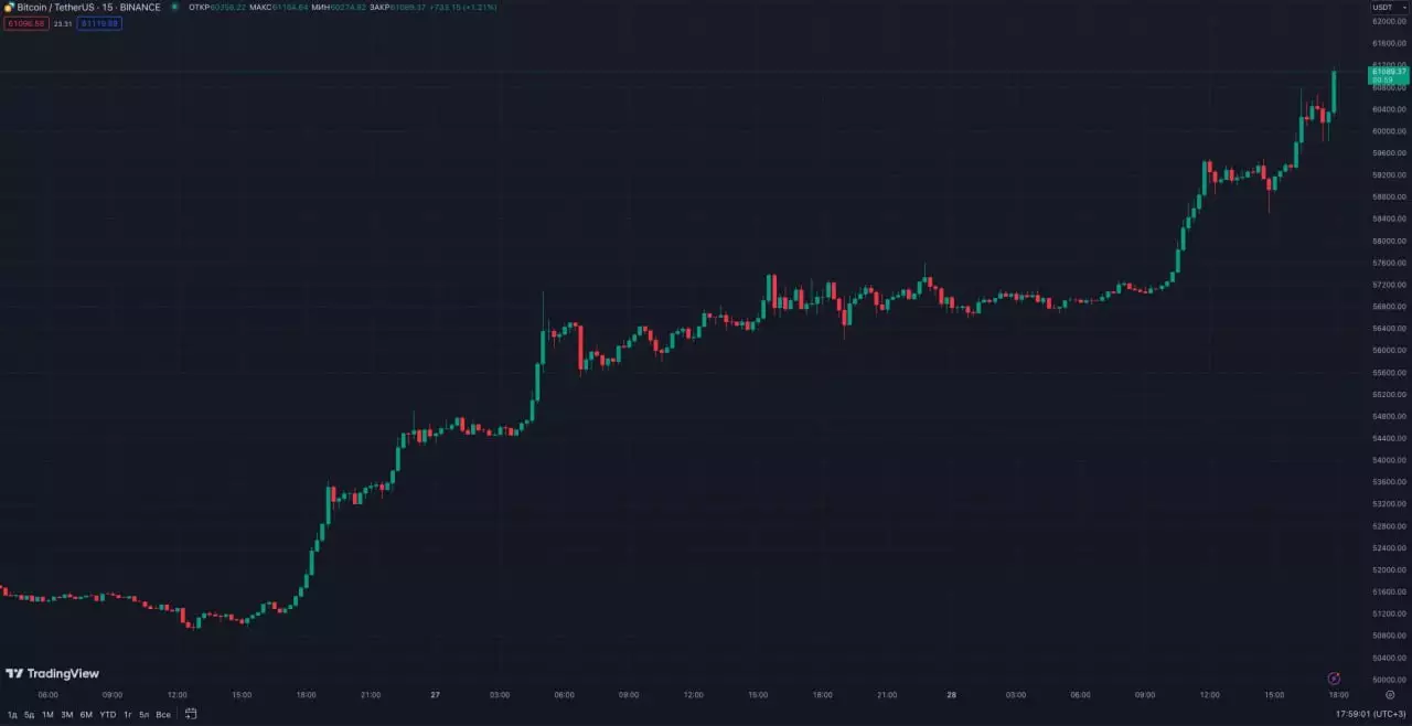 В среду, 28 февраля, днем курс первой криптовалюты преодолел психологически важную отметку в $60 000. А затем также стремительно перешагнул за $61 000. Рост котировок вызван высоким спросом на паи спотовых биржевых фондов на базе криптоактива и ожиданием апрельского халвинга.