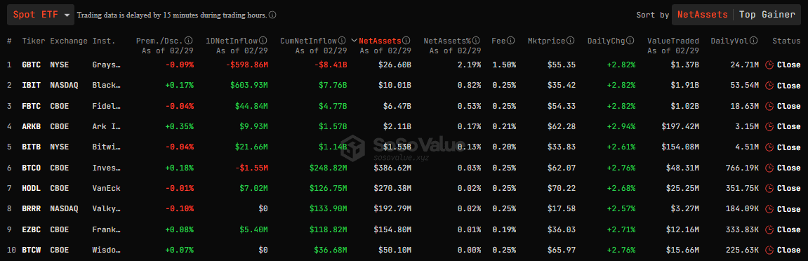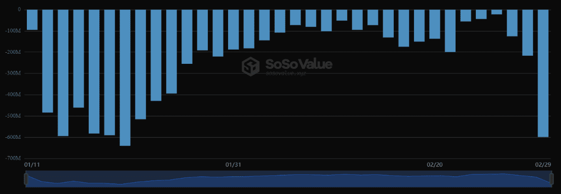 29 февраля 2024 года суточный отток капитала из фонда Grayscale Bitcoin Trust (GBTC) составил $598,86 млн, согласно SoSo Value. Это второй по величине показатель с 11 января 2024 года.