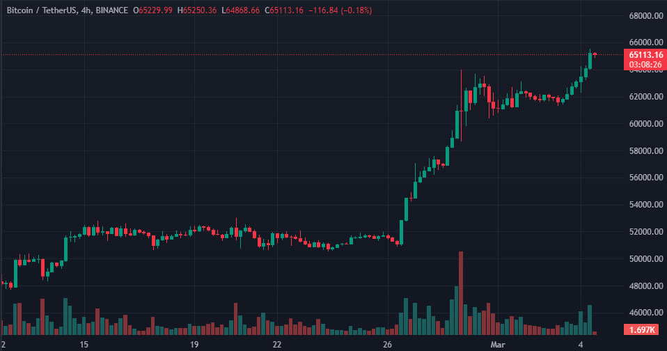 Отметим, утром 4 марта курс биткоина поднялся выше отметки в $65 300. На момент написания актив торгуется вблизи $65 100: