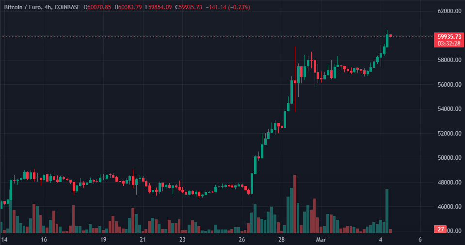 Цена биткоина достигла исторического максимум в торговых парах с евро и британским фунтом. 4 марта 2024 года курс первой криптовалюты вырос до €60 447 и £51 736 на криптовалютной бирже Coinbase.