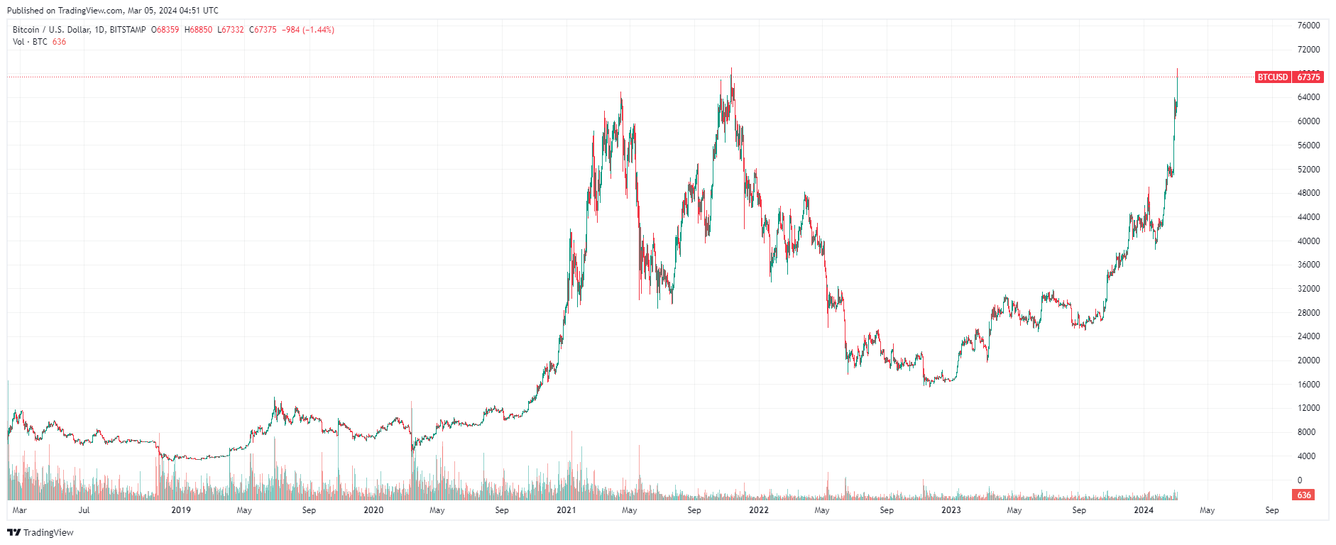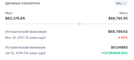 5 марта 2024 года биткоин вплотную подошел к абсолютному максимуму ($ATH). Пик стоимости криптовалюты за 24 часа, по данным CoinMarketCap, зафиксирован на уровне $68 785.