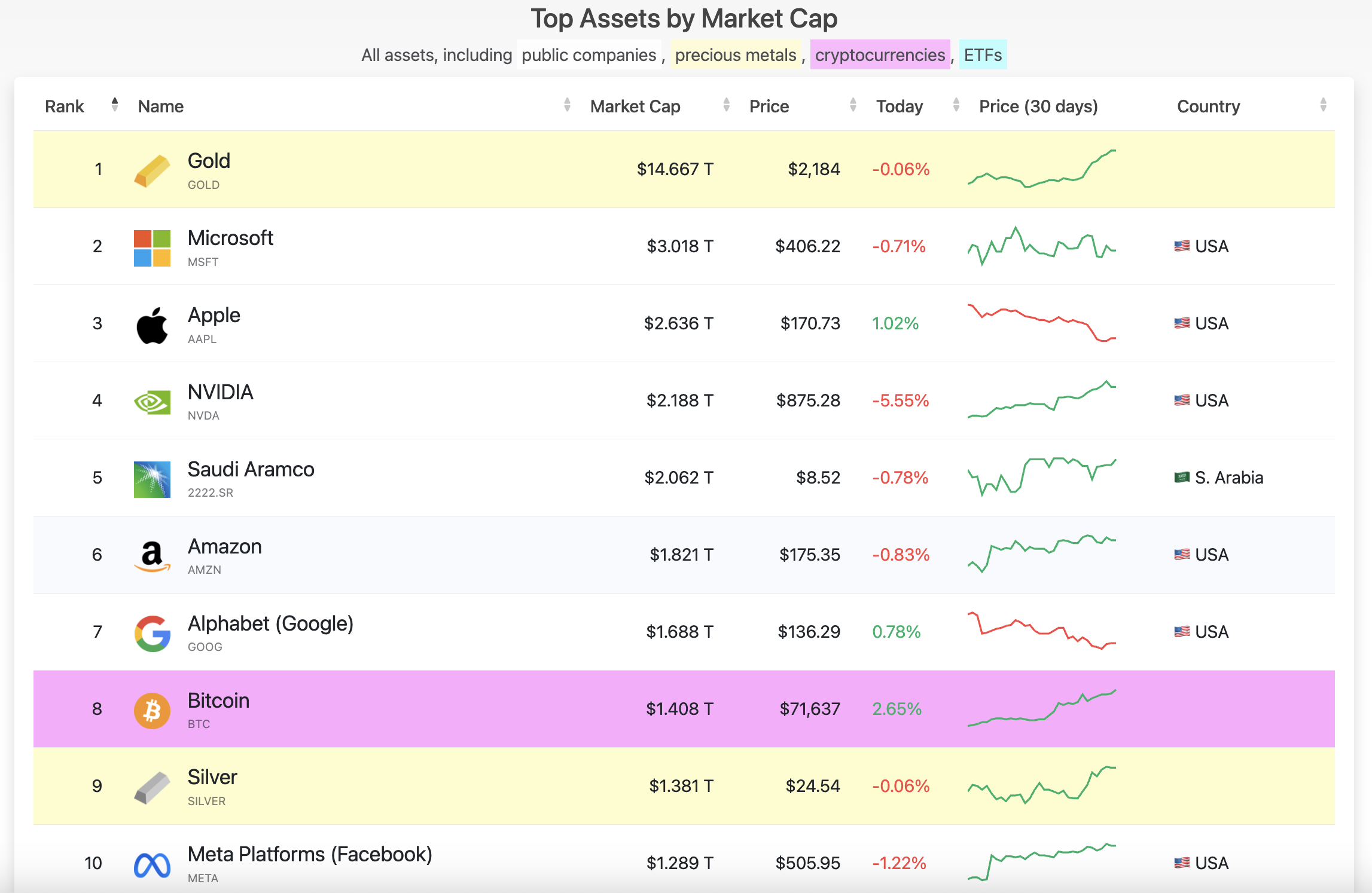По данным сайта Companiesmarketcap, буллран привел к тому, что биткоин обошел серебро и стал восьмым крупнейшим активом в мире с капитализацией в $1,408 трлн. На первом месте рейтинга находится золото, капитализация которого составляет $14,667 трлн.