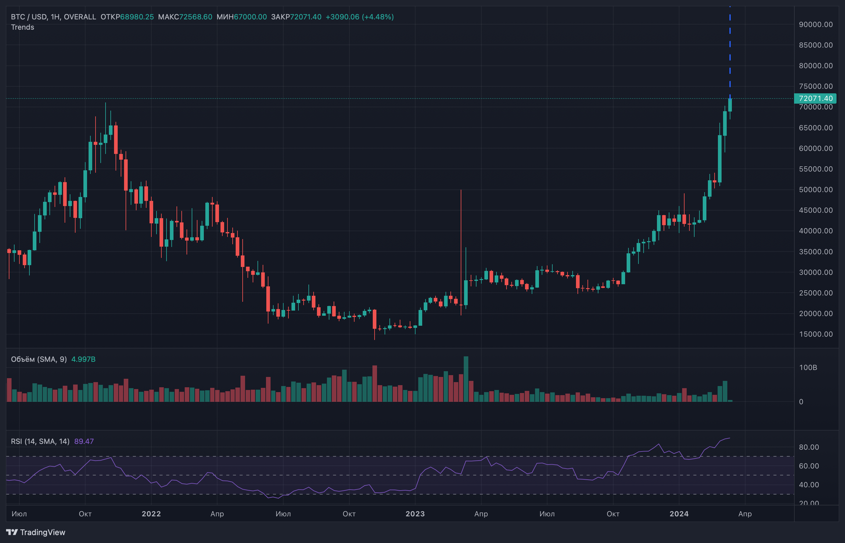 По данным скринера криптовалют Cryptovizor, определяющего цену BTC/USD по результатам торгов на спотовых биржах, биткоин закрыл свою недельную свечу на отметке $68 981. На момент написания статьи, цена актива соответствовала $72 071.