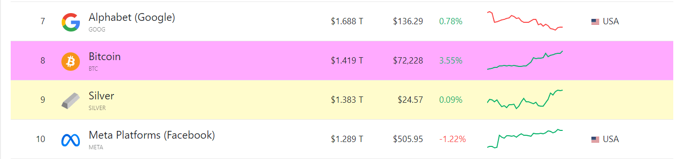 Последний скачок цены биткоина выше $72 000 привёл к тому, что его рыночная капитализация обогнала капитализацию серебра, а криптовалюта стала восьмым по величине этого показателя активом в мире.