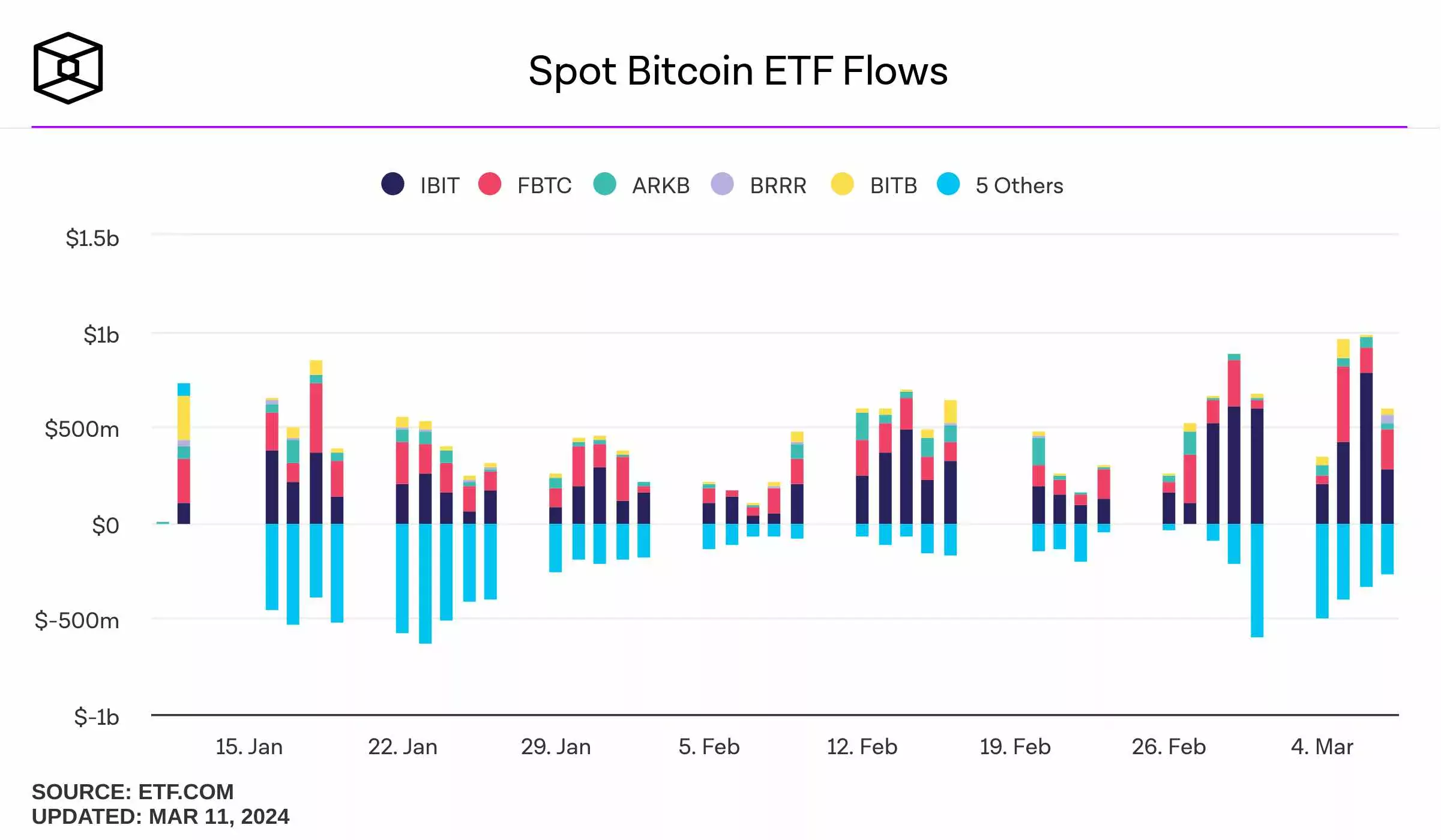 Спотовый биткоин-ETF BlackRock под названием iShares Bitcoin Trust (IBIT) лидирует в гонке ETF с момента его запуска в январе. По данным The Block’s Data Dashboard, в среду он достиг рекордного ежедневного притока в $788,3 млн, чему способствовало превышение давнего ценового рекорда биткоина в $69 000.
