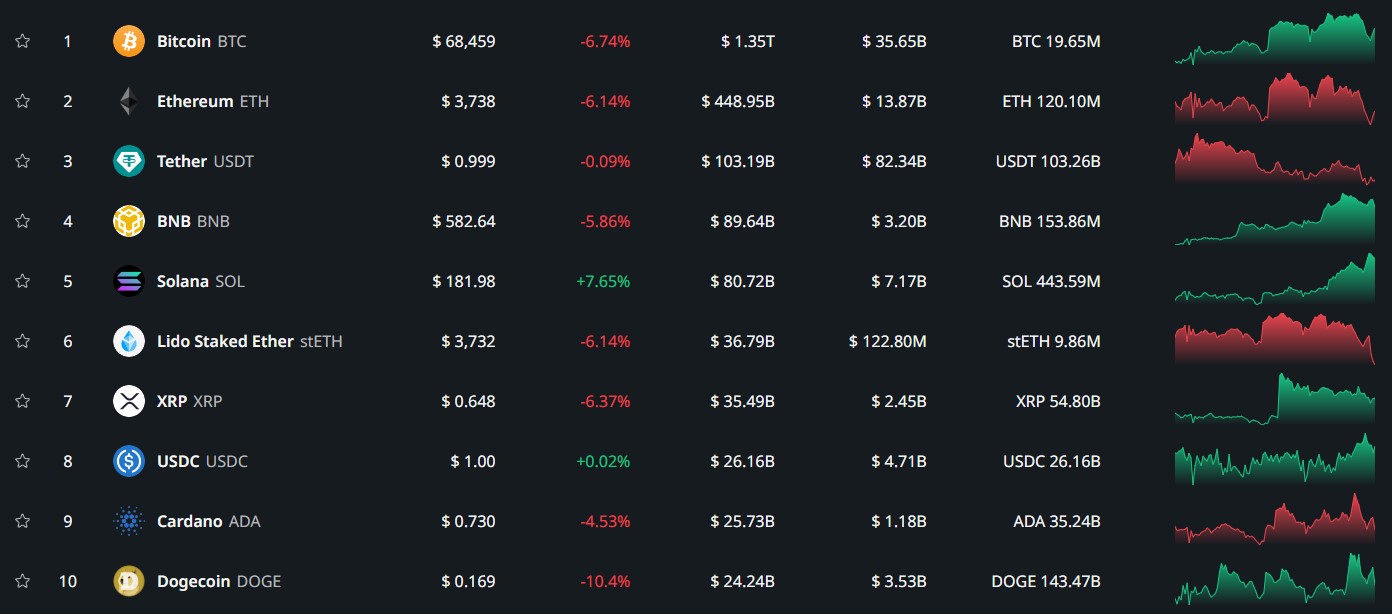 Просадка биткоина оказала влияние на курс других активов. Из топ-10 монет по показателю капитализации восемь находятся в «красной» зоне: