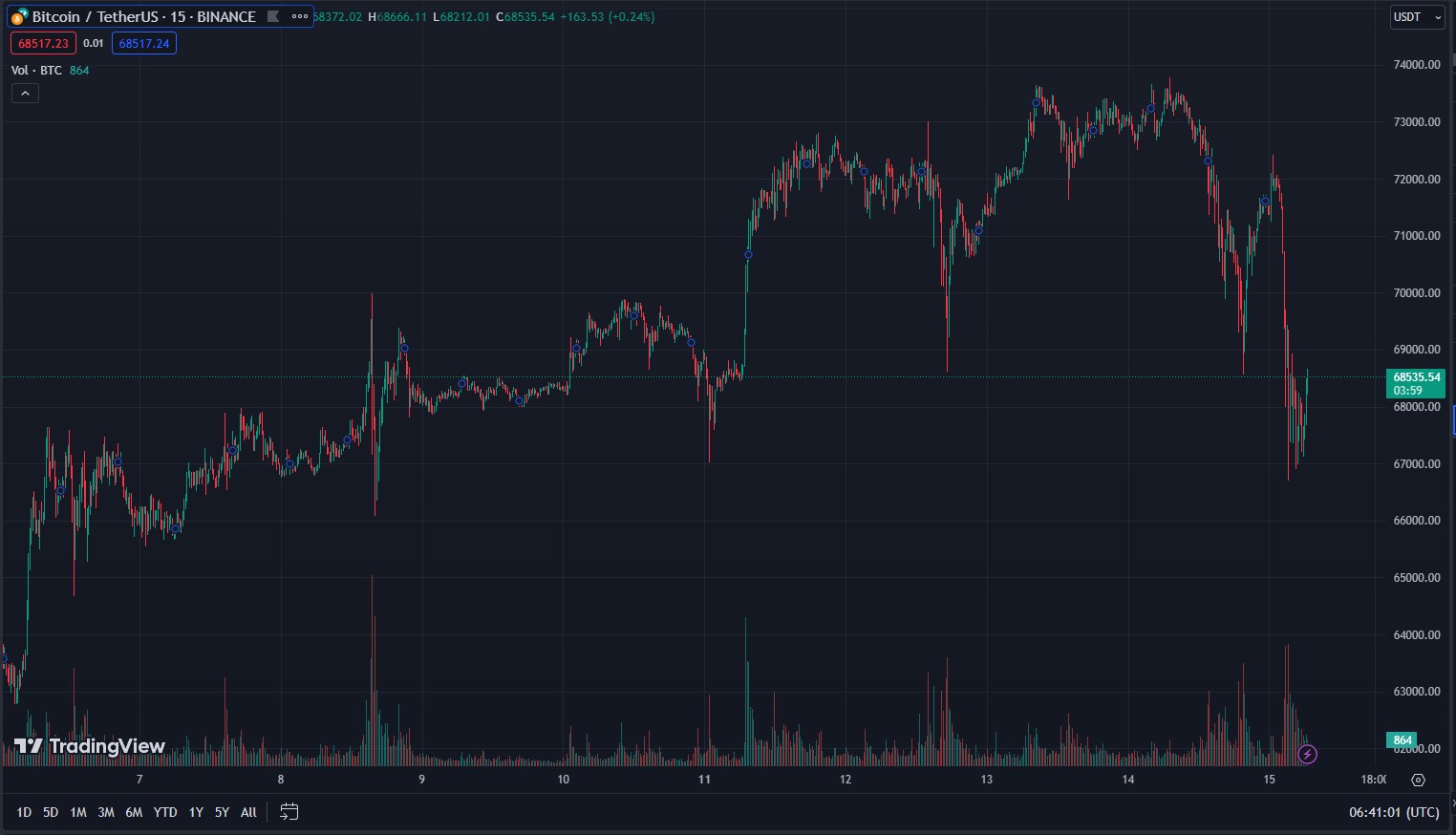 В ночь на 15 марта 2024 года курс биткоина в моменте падал до $66 700, согласно TradingView. Позднее актив восстановил часть утраченных позиций.