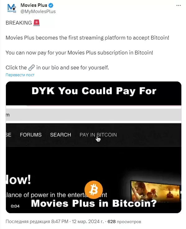 Внедрение биткоина сделало Movies Plus первой стриминговой платформой, принимающей платежи в биткоине. Такие гиганты потокового вещания, как Netflix или Hulu, пока что не поддерживают BTC или какие-либо другие криптовалюты.
