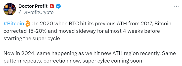 Чтобы ответить на вопрос о том, когда биткоин снова начнет расти, трейдер Doctor Profit обратился к истории. Он считает положение BTC в 2024 году особенным, так как ранее криптовалюте никогда не удавалось обновлять абсолютный максимум стоимости до халвинга. По его мнению, прогноз биткоина можно построить на анализе поведения после предыдущего обновления ATH.