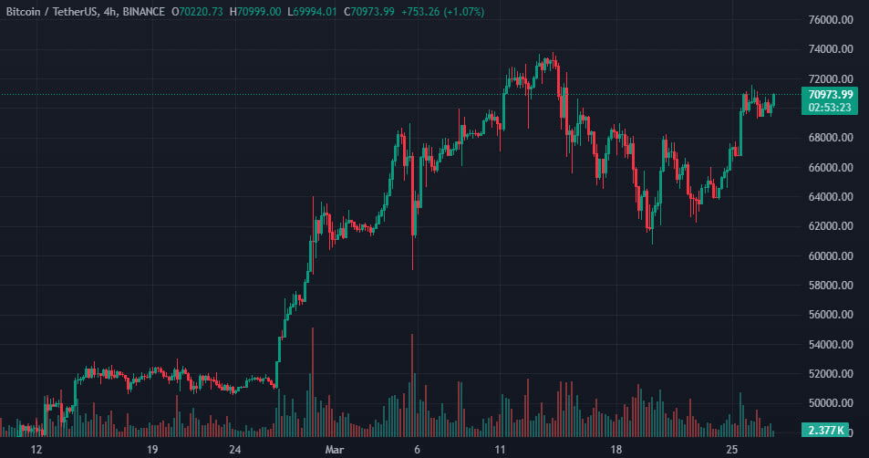 Напомним, на момент написания первая криптовалюта торгуется вблизи $71 000: