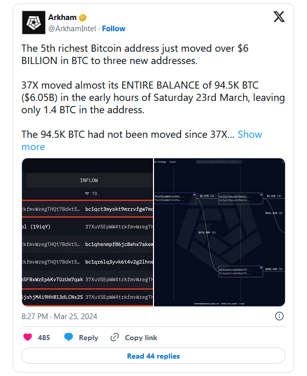 А с 23 по 24 марта пятый по объему накоплений биткоин-адрес перевел монеты на 6 млрд долларов на три новых кошелька. До этого он бездействовал с 2019 года.
