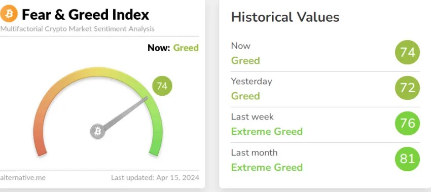Индекс страха и жадности тем временем отошел от пиковых значений, что указывает на снижение ажиотажного спроса на крипту. При этом значения индекса остаются в зеленой зоне.