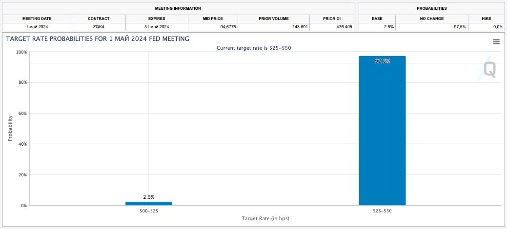 Согласно данным CME FedWatch Tool, 97,5% участников рынка считают, что ФРС оставит неизменной процентную ставку на грядущем заседании 1 мая.