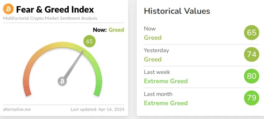 Индекс страха и жадности снижается, но остается в зеленой зоне. Такое положение говорит о сохранении интереса и готовности покупателей к инвестициям в крипту. Снижение метрики от экстремальных значений также может указывать на охлаждение рынка и снижение цен до справедливых значений.