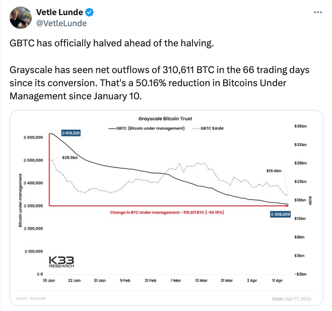 «Уполовинивание» GBTC произошло всего за два дня до долгожданного халвинга, в результате которого вознаграждение за майнинг уменьшится на 50% с 6,25 BTC до 3,125 BTC.