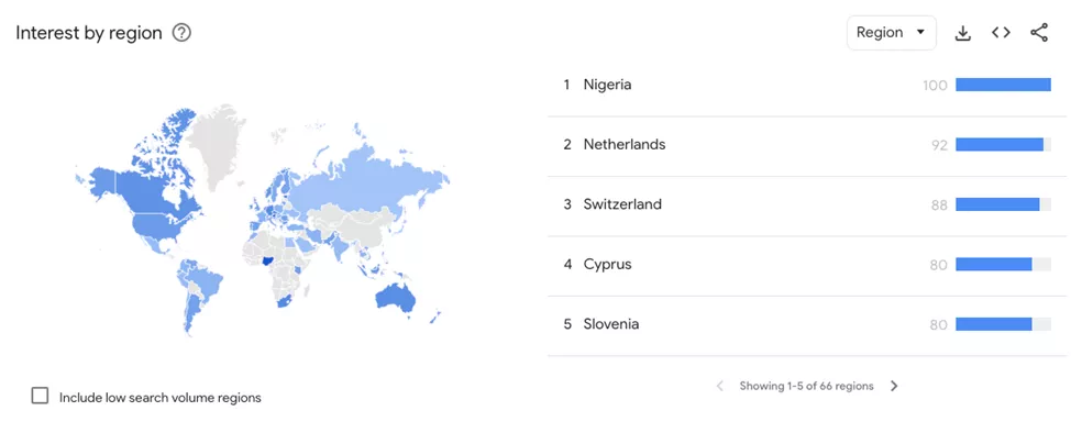 Наибольший интерес к уполовиниванию награды майнерам проявляют жители Нигерии, Нидерландов, Швейцарии и Кипра.
