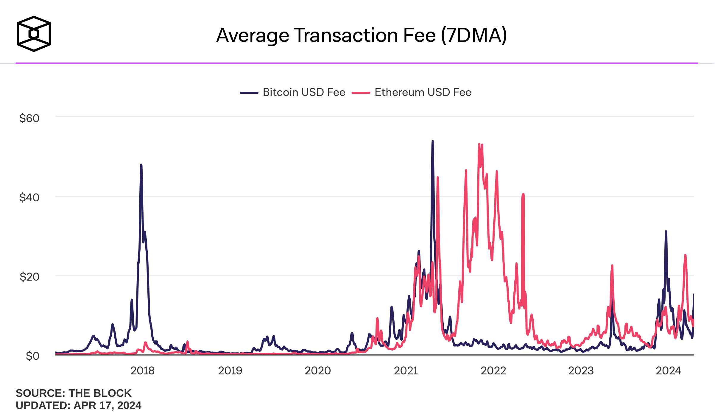 По сравнению с максимумами декабря 2023 года это довольно низкое значение, но этого скачка достаточно, чтобы поднять комиссию в блокчейне биткоина больше, чем в Ethereum.