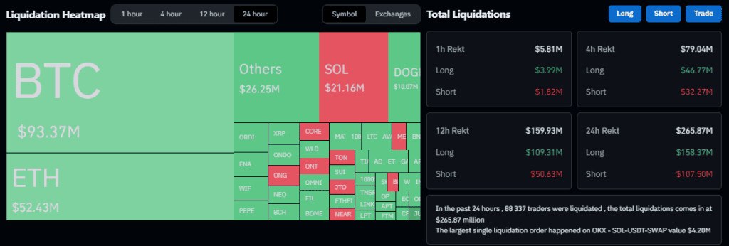 За последние сутки были ликвидированы позиции 88 337 трейдеров. Примерно $158 млн потерь пришлось на лонг-позиции, почти $108 млн — на шорт.