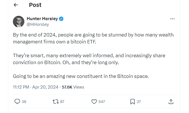 Генеральный директор Bitwise Хантер Хорсли предсказал, что компании по управлению активами увеличат свои биржевые фонды биткоин (ETF) с точки зрения запасов. Прогноз сделан в то время, когда биткоин-ETF, как ожидается, приобретут еще большую популярность после халвинга.