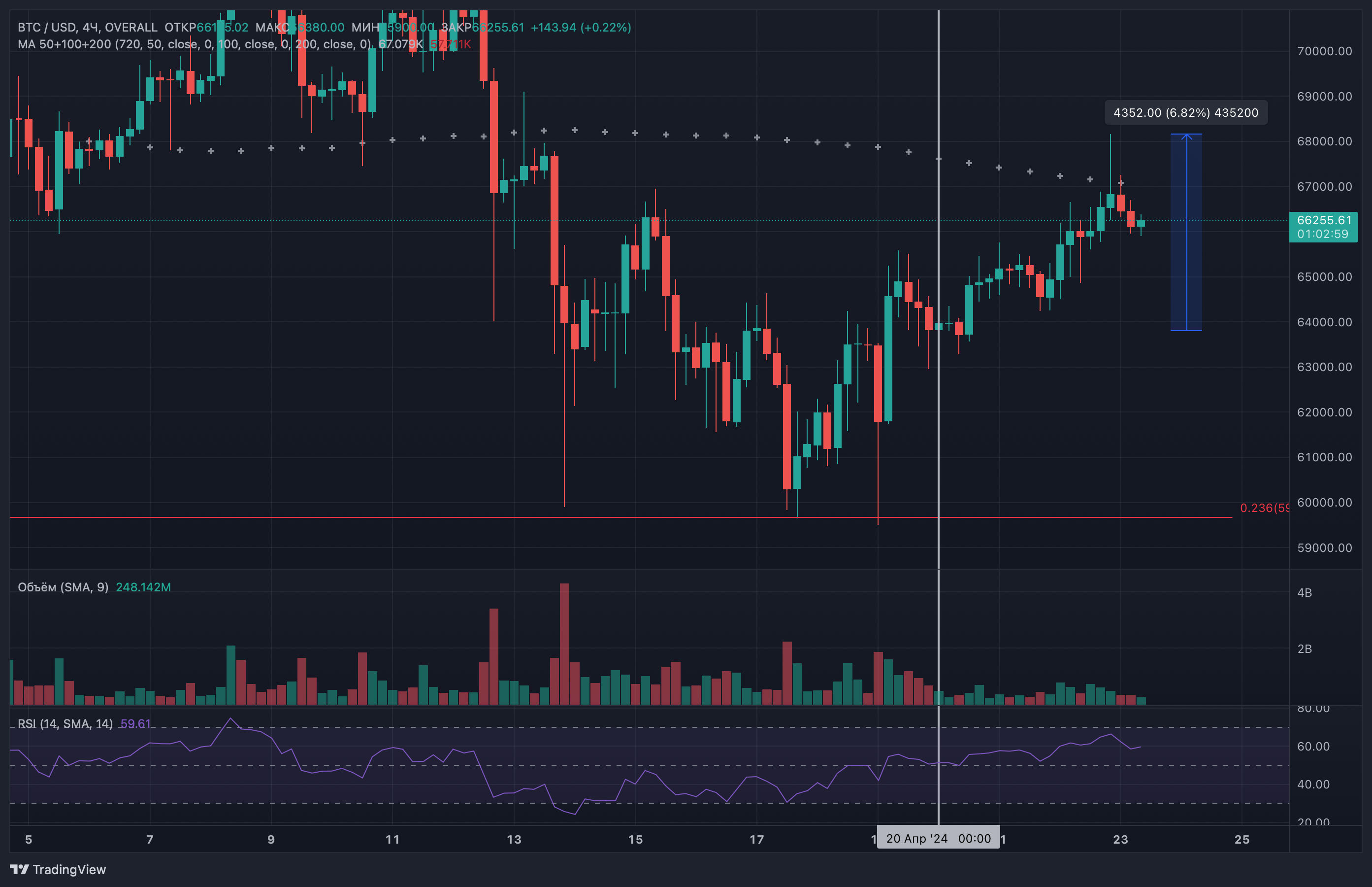 По данным скринера криптовалют Cryptovizor, определяющего цену BTC/USD по результатам торгов на спотовых биржах, с момента халвинга по 22 апреля биткоин продемонстрировал рост на 6,82%.