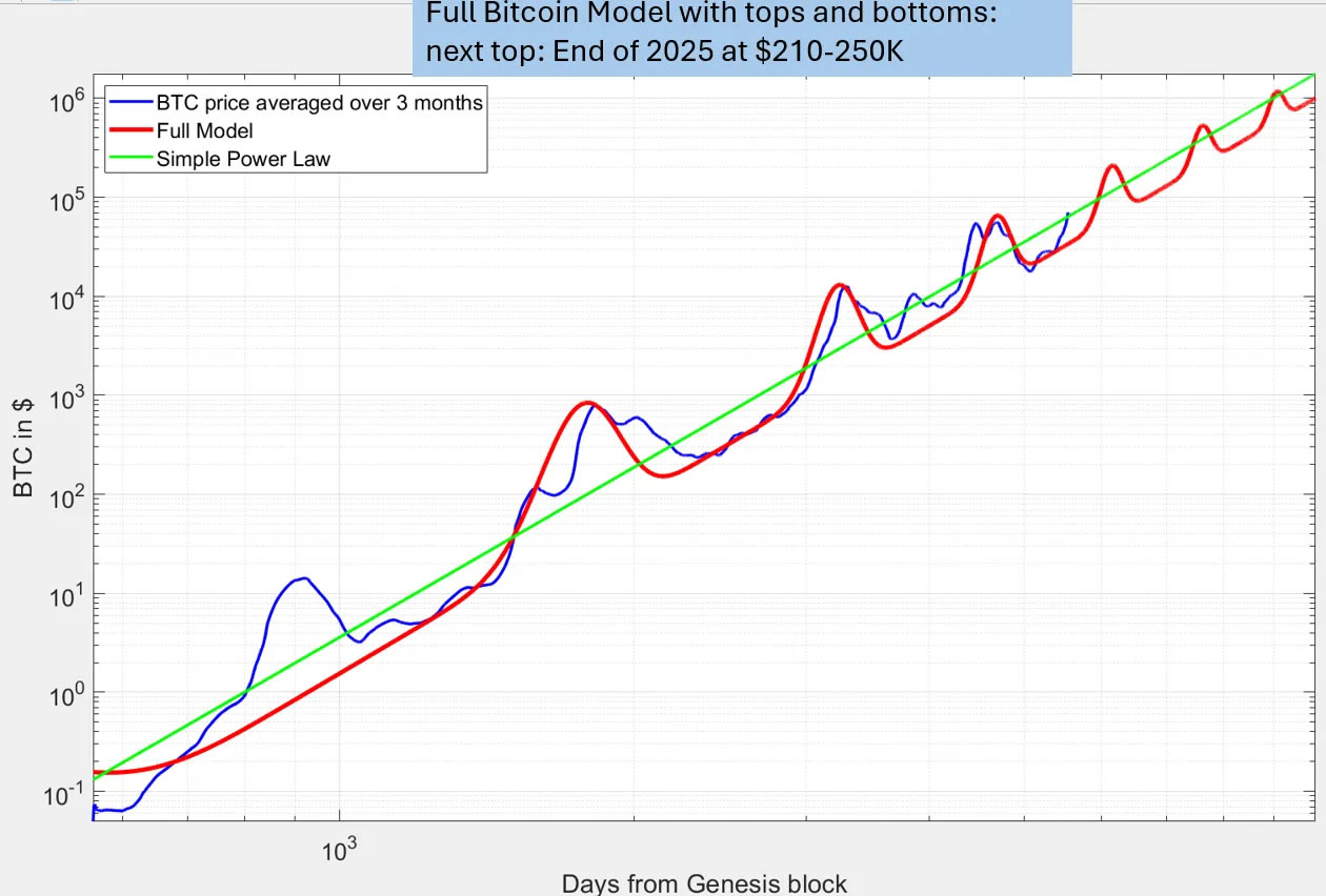 Сантостаси измерил процентное отклонение пиков цены от долгосрочного тренда, экстраполировав его с помощью степенной зависимости, начиная с генезис-блок биткоина. Используя полученную модель, он прогнозирует, что пик четвертого цикла будет достигнут в декабре 2025 года на уровне $210 000. При этом дно следующего цикла будет находиться на уровне $83 000.
