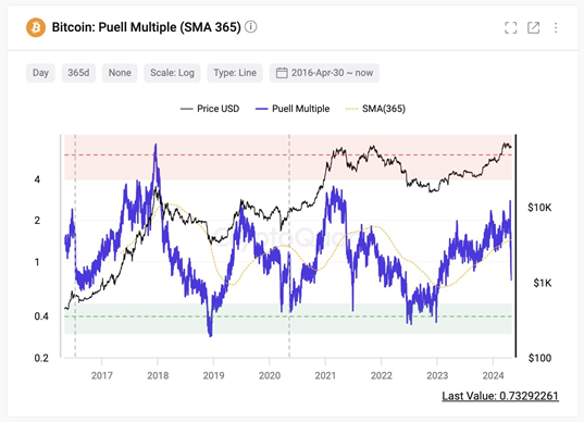 Ки Юн Джу указал на мультипликатор Пьюэлла, значения которого равноудалены от вершины и минимума цикла, что показывает на отсутствие причин для продаж со стороны майнеров для оплаты издержек.