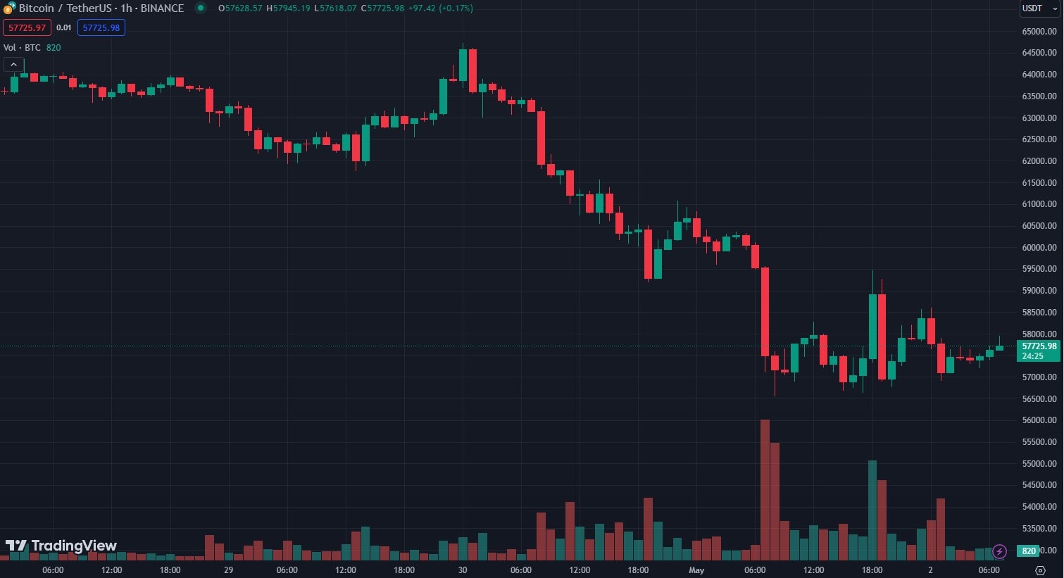На момент написания первая криптовалюта торгуется выше $57 500, а ее капитализация превышает $1,14 трлн, согласно CoinMarketCap. Отметим, биткоин закрыл апрель 2024 года с просадкой в 14,7%.