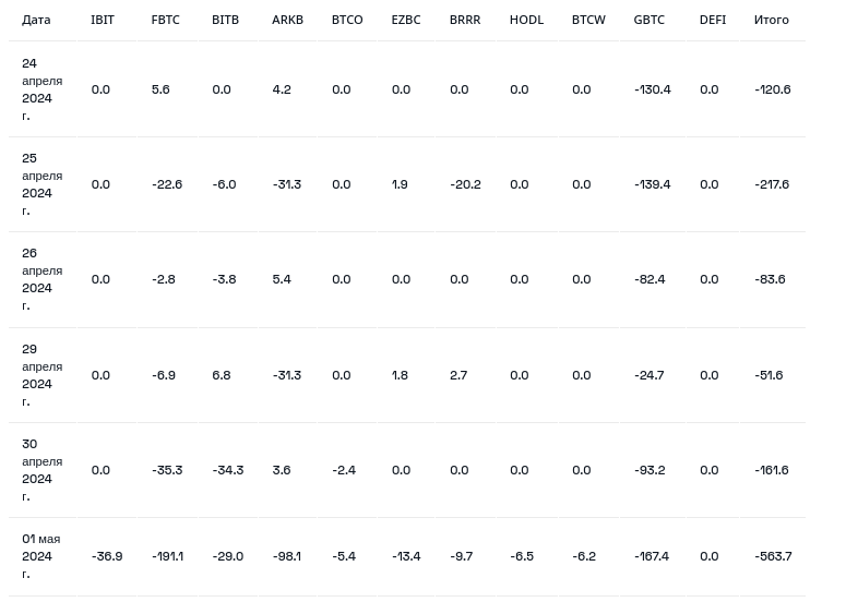 1 мая отток из спотовых ETF на биткоин (BTC) достиг $563,8 млн. Фонд iShares Bitcoin Trust (IBIT) крупнейшего в мире управляющего активами BlackRock лишился $36,93 млн. Об этом свидетельствуют данные Farside Investors.
