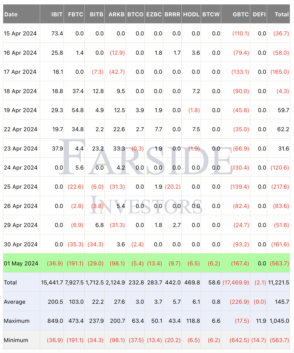 1 мая оказался днем самого крупного оттока средств из спотовых биткоин-ETF в США с момента их запуска в январе. Биткоин-ETF ARK 21Shares и биткоин-ETF Franklin также зафиксировали отток средств в размере $98,1 млн и $13,4 млн соответственно.