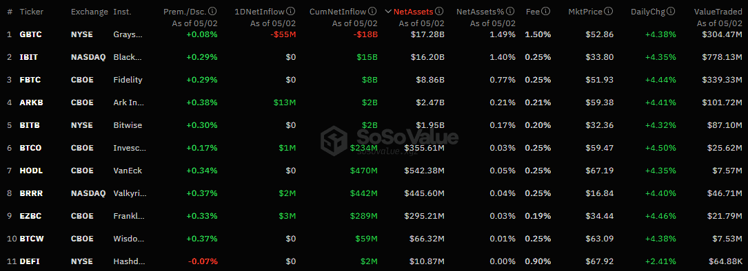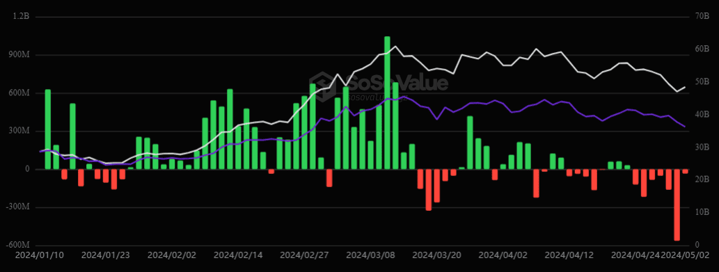 2 мая 2024 года в секторе спотовых биткоин-ETF зафиксирован отток капитала в размере $34,36 млн, по данным SoSo Value. Это значительно меньше показателя от 1 мая.