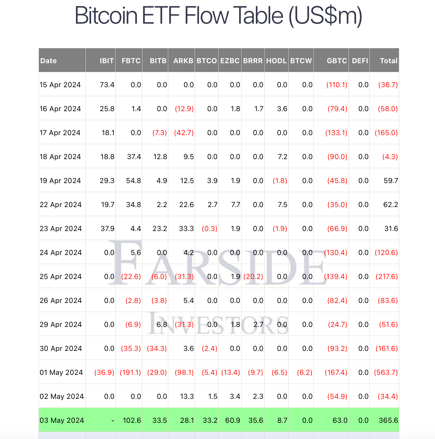 Согласно предварительным данным Farside, 3 мая Bitcoin Trust (GBTC) компании Grayscale зафиксировал чистый приток в размере 63 миллионов долларов США после регистрации оттока примерно 17,5 миллиардов долларов США с момента запуска 11 января 11 спотовых биткоин-ETF.