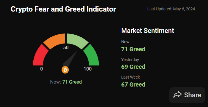 Индекс страха и жадности за последние 24 часа вырос на два базисных пункта. Он указывает на настроения к накоплению среди инвесторов: