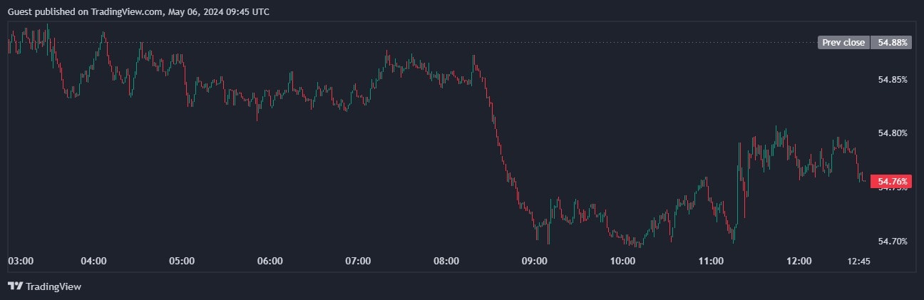 На фоне скачка курс показатель доминирования актива восстановил часть позиций. Утром 6 мая 2024 года он просел в моменте до 54,69%. При подготовке материала он составляет 54,76%: