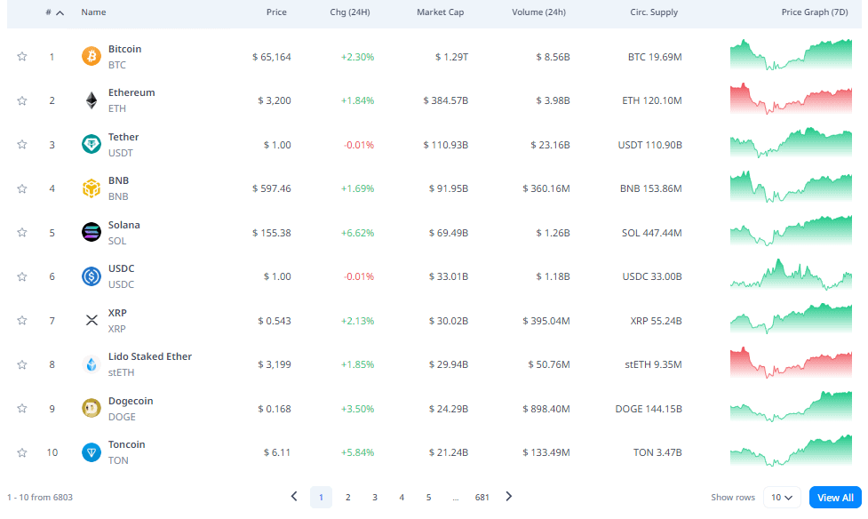 Наравне с биткоином приростом отметились и другие активы из топ-10 по показателю капитализации. Лидером тут является Solana (SOL) — 6,62%.