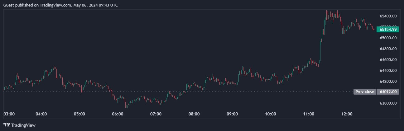 6 мая 2024 года курс биткоина преодолел уровень выше $65 000 и закрепился на нем, согласно TradingView. Суточный прирост по позиции составил 1,8%.